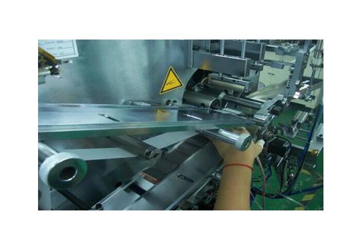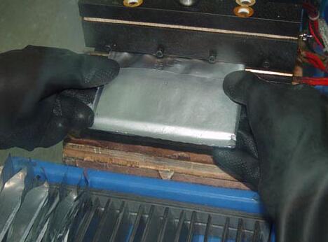 用自動折邊機裁掉電池兩邊多余的外鋁塑復(fù)合膜及折邊自動完成。