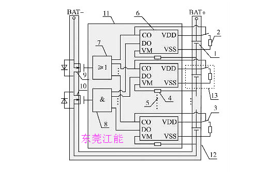 其中:1為單節(jié)鋰離子電池;2為充電過電壓分流放電支路電阻;3為分流放電支路控制用開關(guān)器件;4為過流檢測保護(hù)電阻;5為省略的鋰電池保護(hù)芯片及電路連接部分;6為單節(jié)鋰電池保護(hù)芯片(一般包括充電控制引腳CO,放電控制引腳DO,放電過電流及短路檢測引腳VM,電池正端VDD,電池負(fù)端VSS等);7為充電過電壓保護(hù)信號(hào)經(jīng)光耦隔離后形成并聯(lián)關(guān)系驅(qū)動(dòng)主電路中充電控制用MOS管柵極;8為放電欠電壓、過流、短路保護(hù)信號(hào)經(jīng)光耦隔離后形成串聯(lián)關(guān)系驅(qū)動(dòng)主電路中放電控制用MOS管柵極;9為充電控制開關(guān)器件;10為放電控制開關(guān)器件;11為控制電路;12為主電路;13為分流放電支路。單節(jié)鋰電池保護(hù)芯片數(shù)目依據(jù)鋰電池組電池?cái)?shù)目確定,串聯(lián)使用,分別對(duì)所對(duì)應(yīng)單節(jié)鋰電池的充放電、過流、短路狀態(tài)進(jìn)行保護(hù)。該系統(tǒng)在充電保護(hù)的同時(shí),通過保護(hù)芯片控制分流放電支路開關(guān)器件的通斷實(shí)現(xiàn)均衡充電,該方案有別于傳統(tǒng)的在充電器端實(shí)現(xiàn)均衡充電的做法,降低了鋰電池組充電器設(shè)計(jì)應(yīng)用的成本。