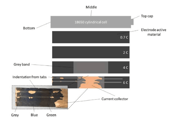 實(shí)驗(yàn)中L. Somerville采用了商業(yè)的NMC/石墨18650電池,以盡可能還原商用鋰離子電池中石墨負(fù)極的工作狀態(tài)。充電速率被設(shè)定為0.7,2,4,6C,放電速率為C/3,電池溫度控制在25℃。